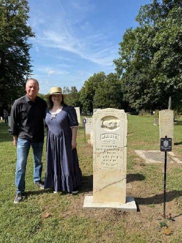 Cemetery restoration specialist Kurt Jordan stands with a character actor beside the restored gravestone marker for Marie Meisenheimer. Jordan believes Meisenheimer was the first individual buried at Greenwick. Photo Credit: Marshall White/Savannah Reporter