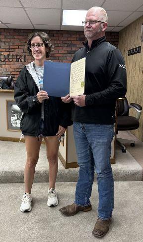Diane Gould accepts a proclamation of support on behalf of the Andrew County Aquatics Initiative from Mayor Kirk Larson. Photo Credit: Kathy Bunse/The Savannah Reporter